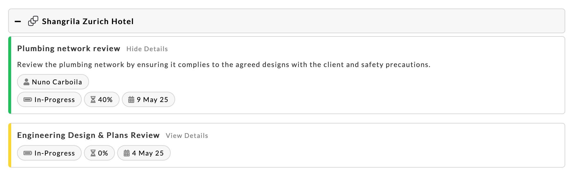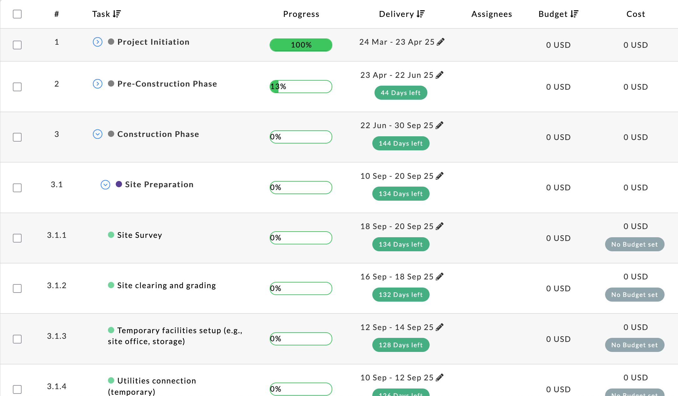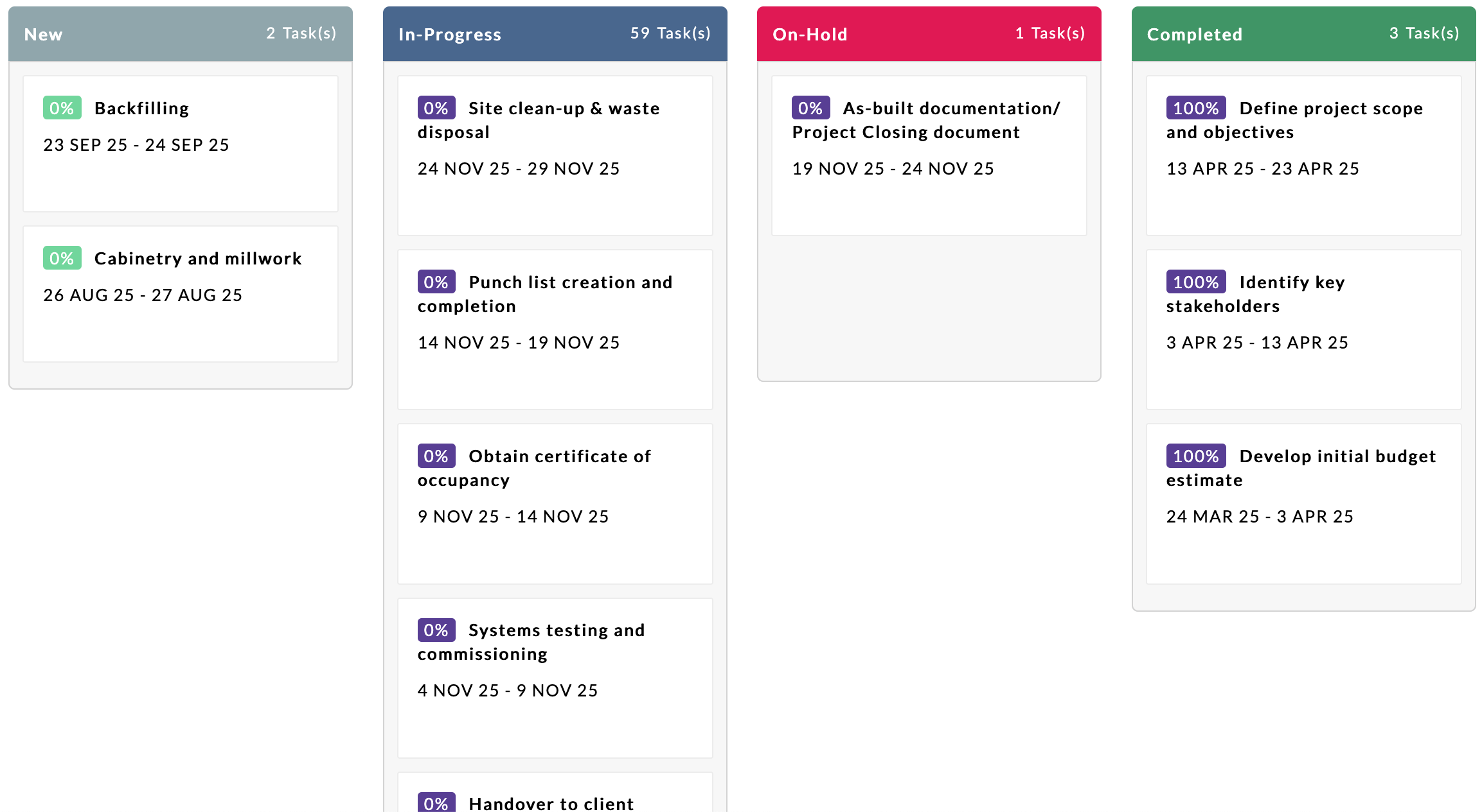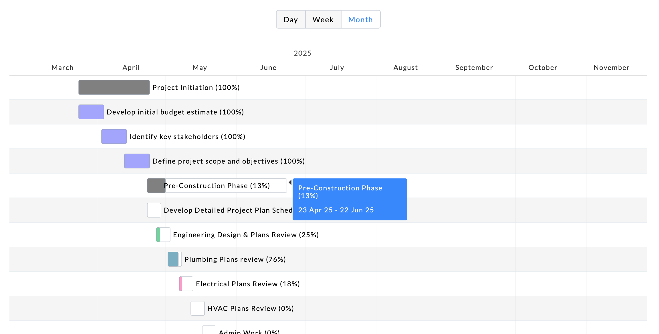 Use the Gantt view to schedule complex construction phases with clarity. See dependencies, milestones, and due dates in one timeline.