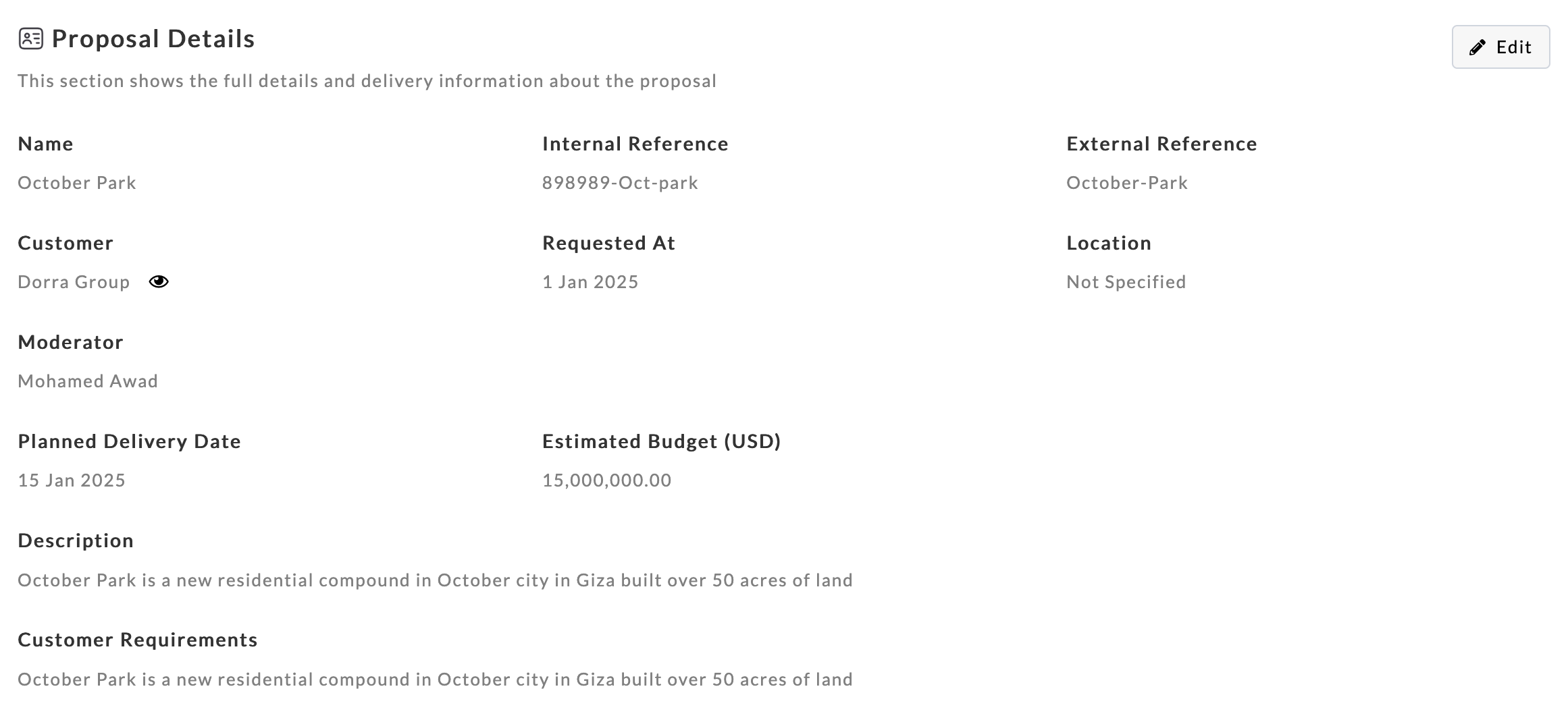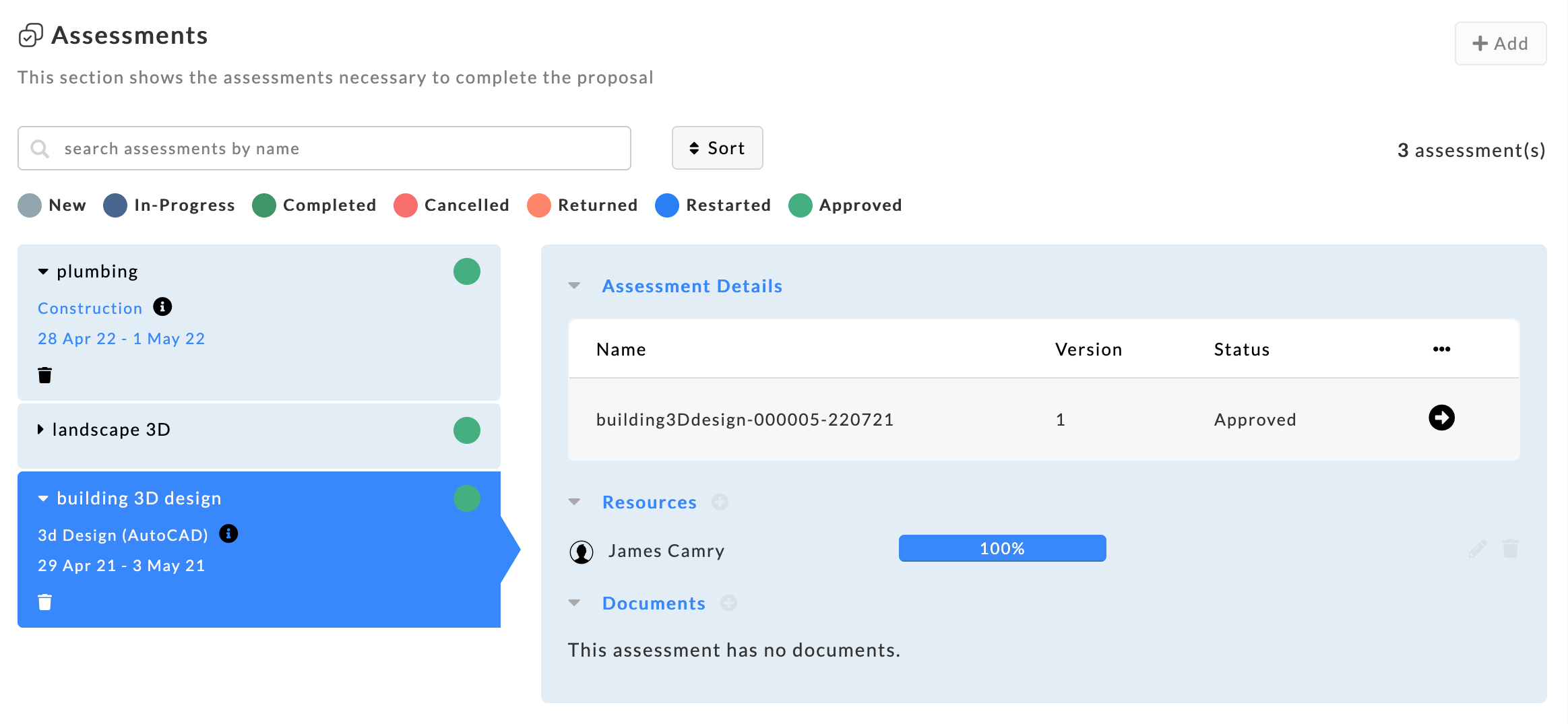 Every proposal includes a full assessment flow with version tracking, statuses, and associated resources or documents.