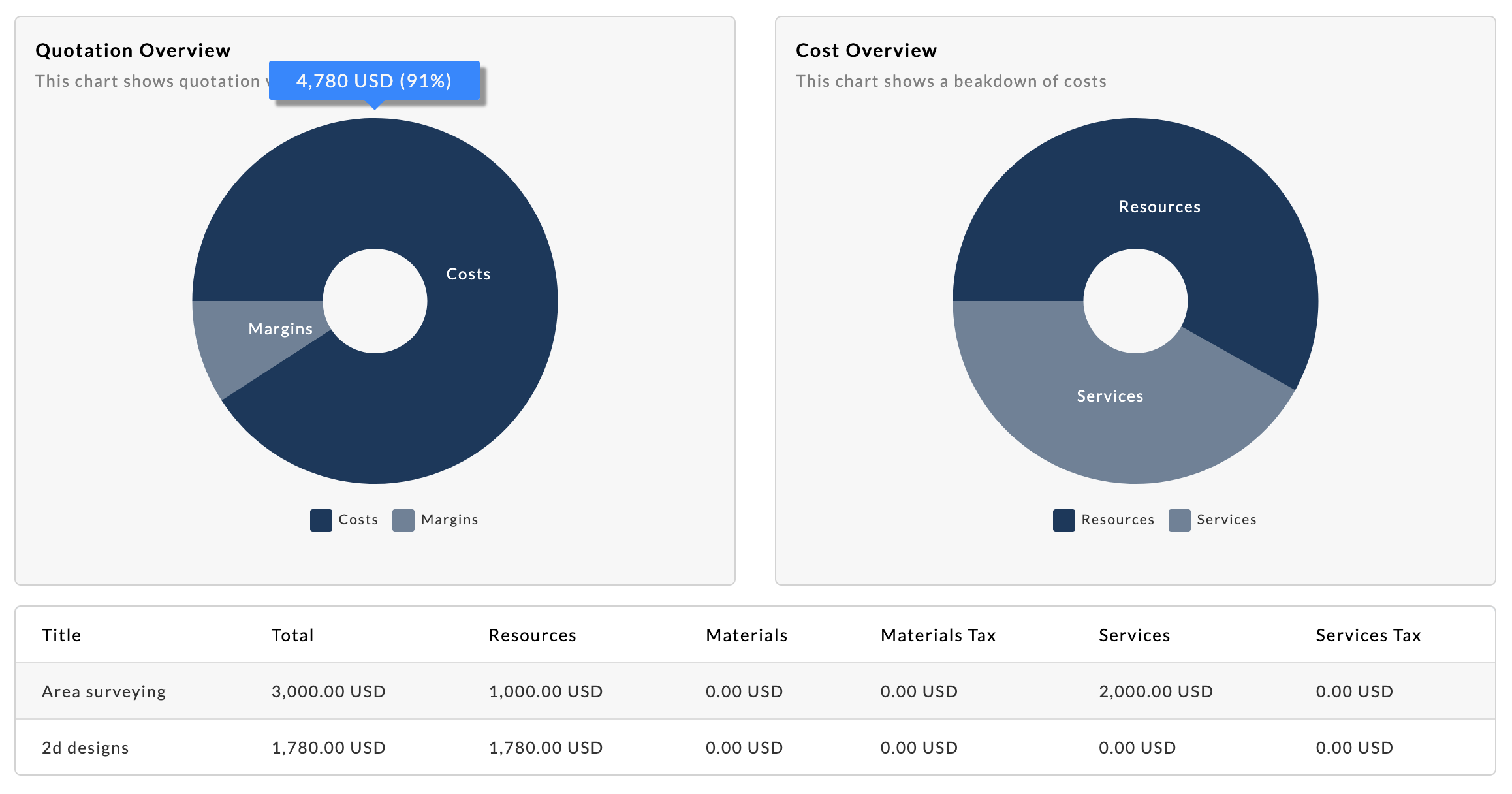Compare projected quotation vs. actual cost in real-time. Visualize profitability and cost structure in clear, dynamic charts.