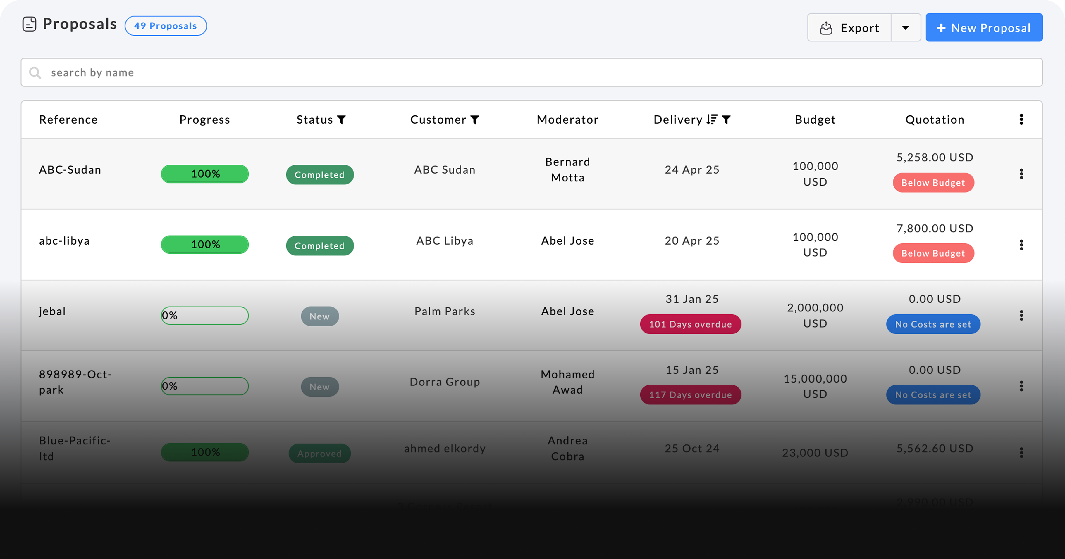 Each proposal includes customer details, request dates, delivery expectations, and internal notes — all editable in one view.