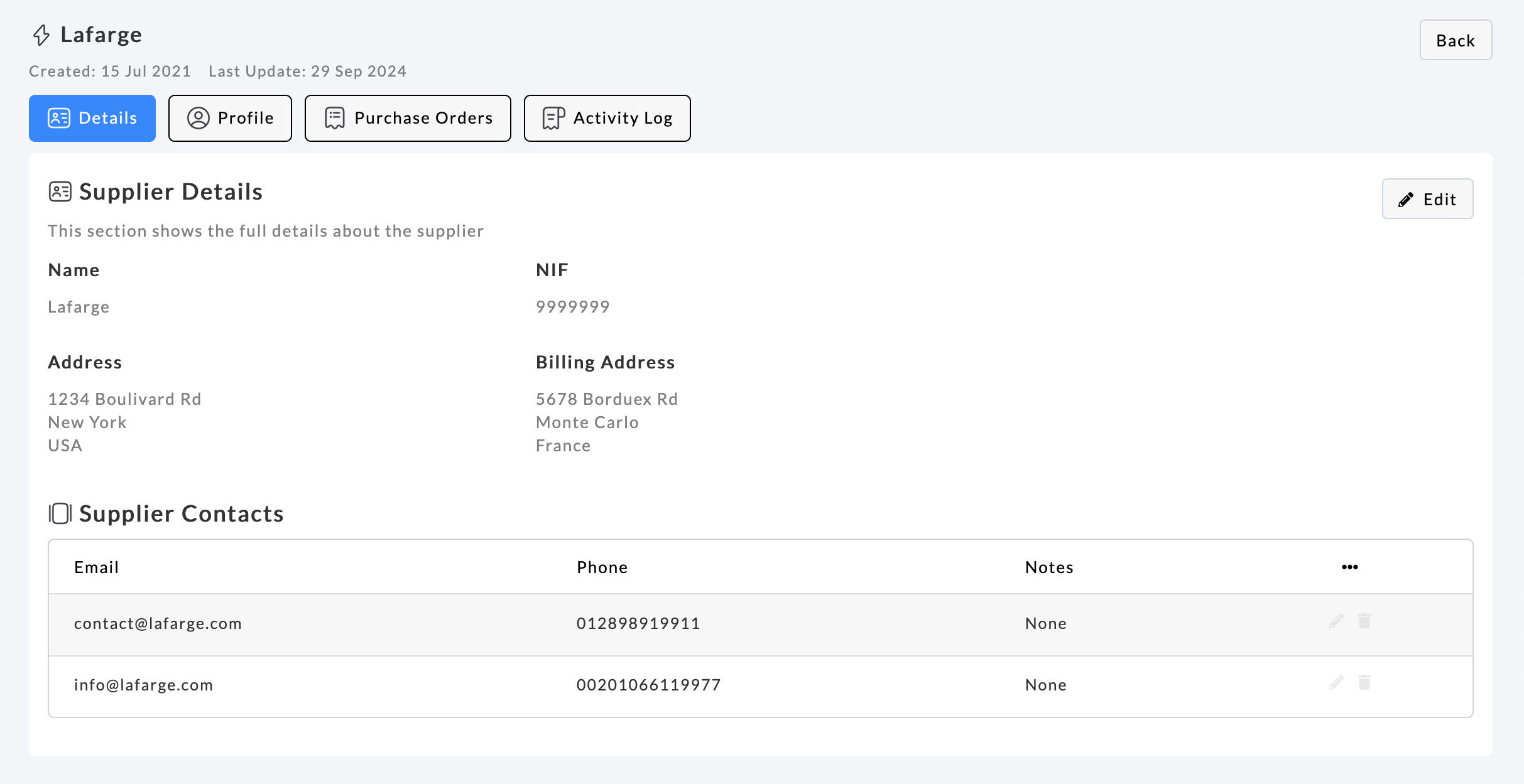 Each supplier profile includes official info, materials supplied, available services, and internal notes—always editable.