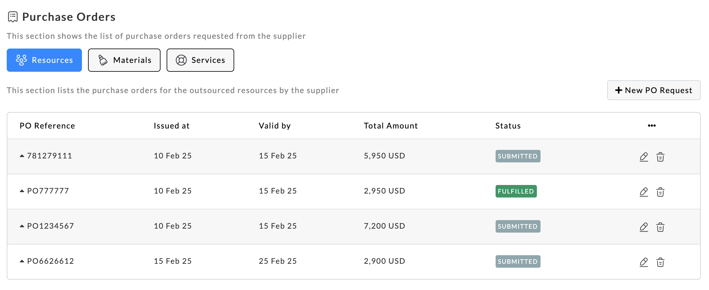 Create, view, and manage purchase orders across services, resources, and materials. Everything is linked back to the supplier.