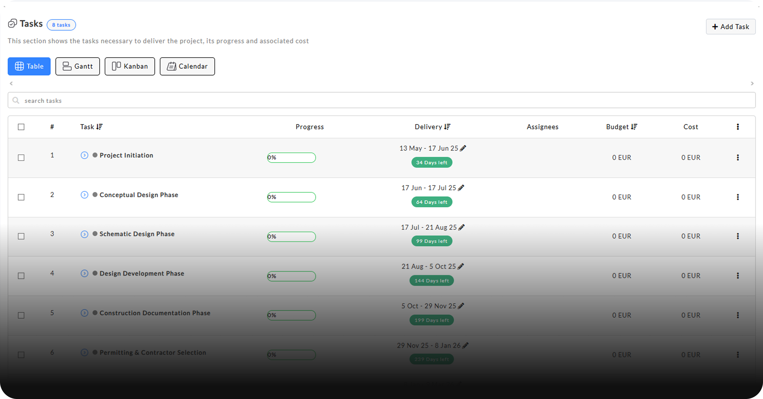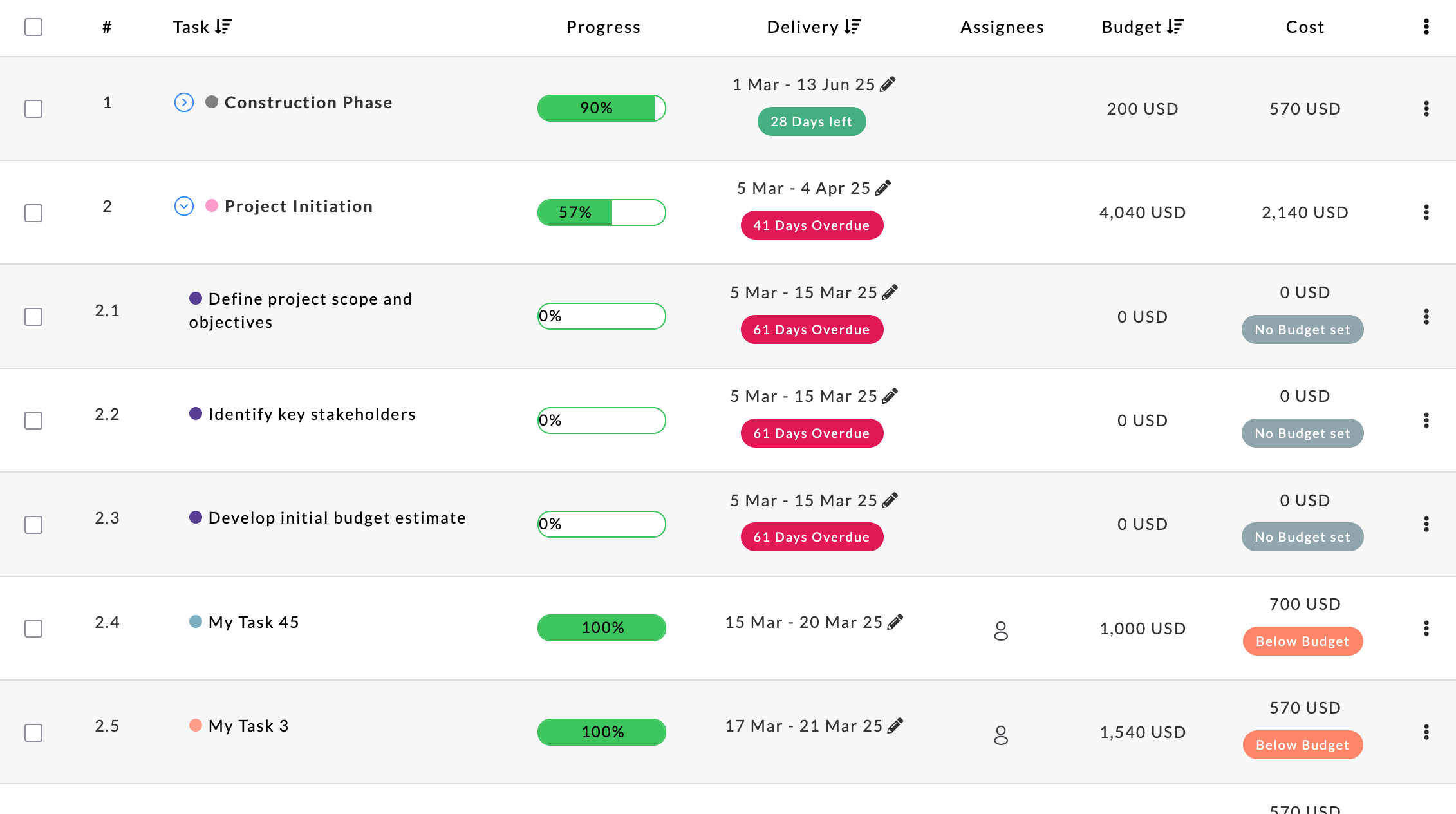 Use the Gantt view to schedule complex construction phases with clarity. See dependencies, milestones, and due dates in one timeline.
