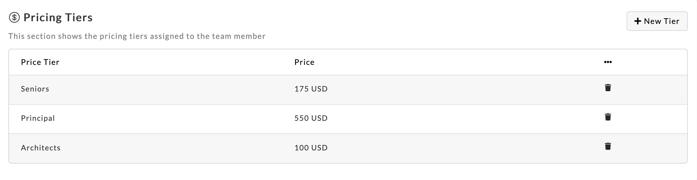 Define pricing tiers by role or skill. Taskeeper applies the correct rate automatically in project cost calculations.