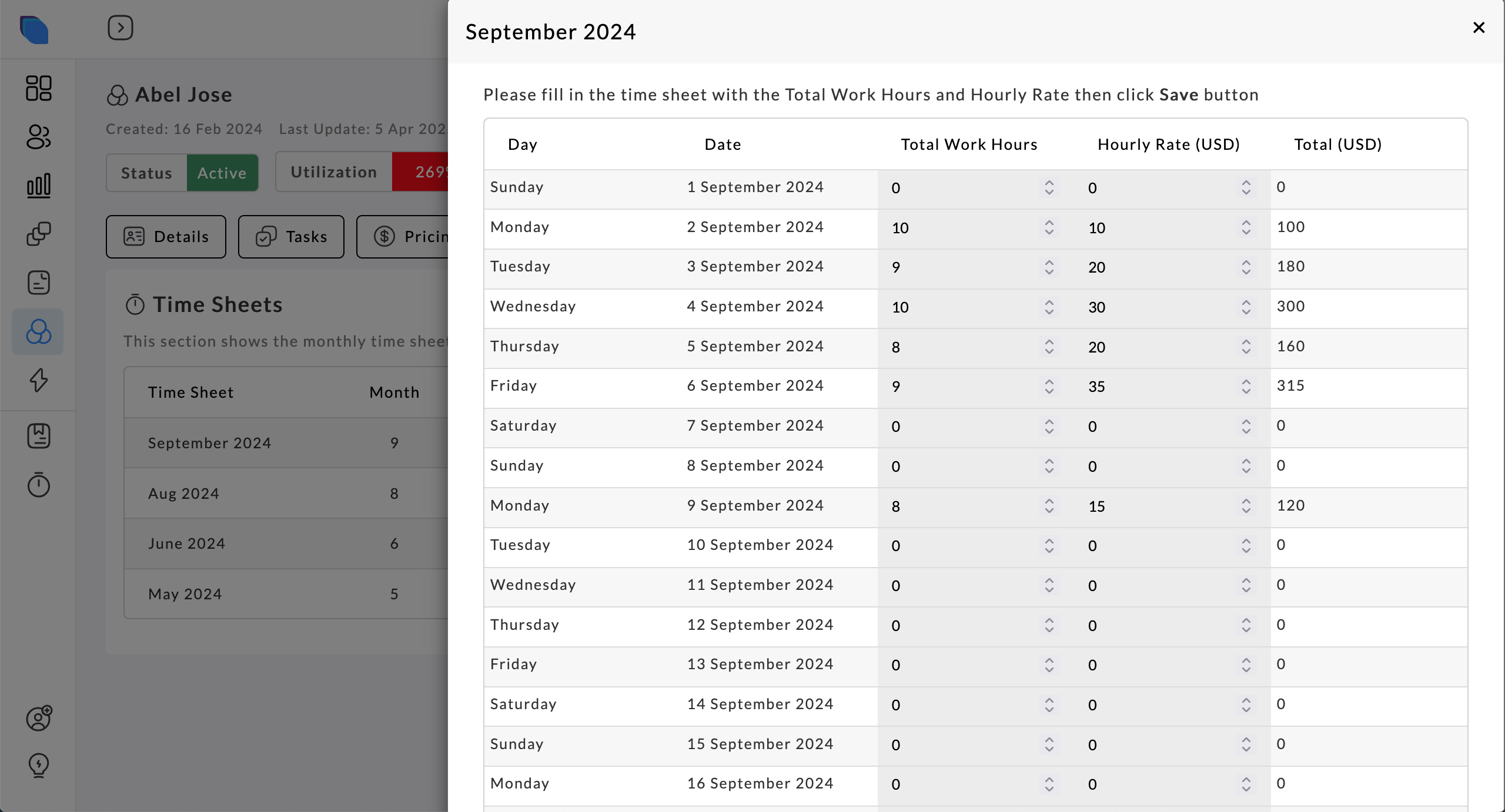 Track time spent per member each month—including total workdays, hours, and billable amounts. Reduce admin time with pre-filled values.